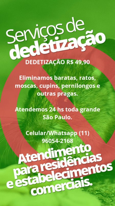 DEDETIZAÇÃO A PARTIR DE R- 49,90 Eliminamos baratas, ratos, pulgas, cupins e outras pragas, atendemos 24 hs em São Paulo. Orçamento sem compromisso. Aceitamos todos os cartões de crédito, débito, boleto e dinheiro.
